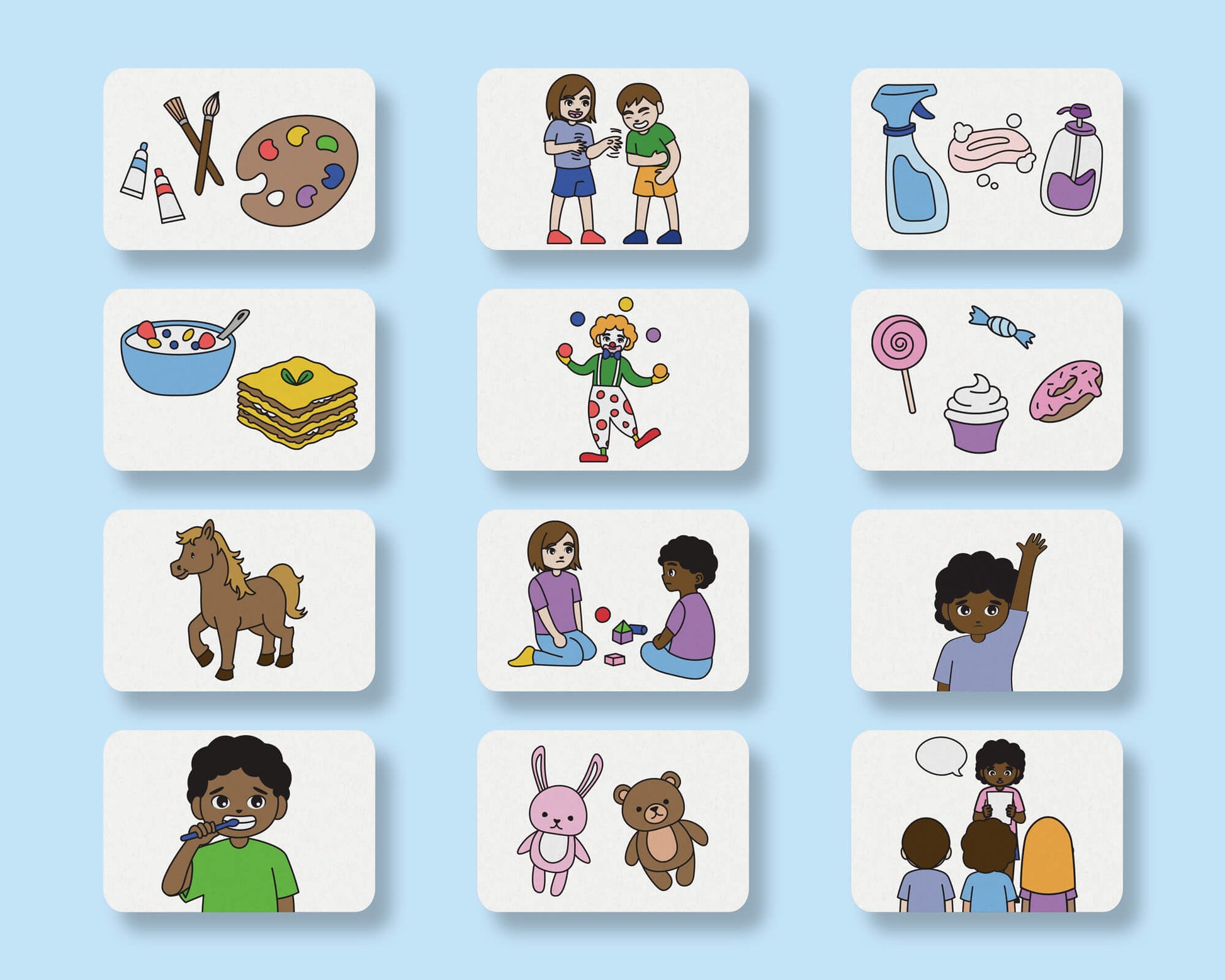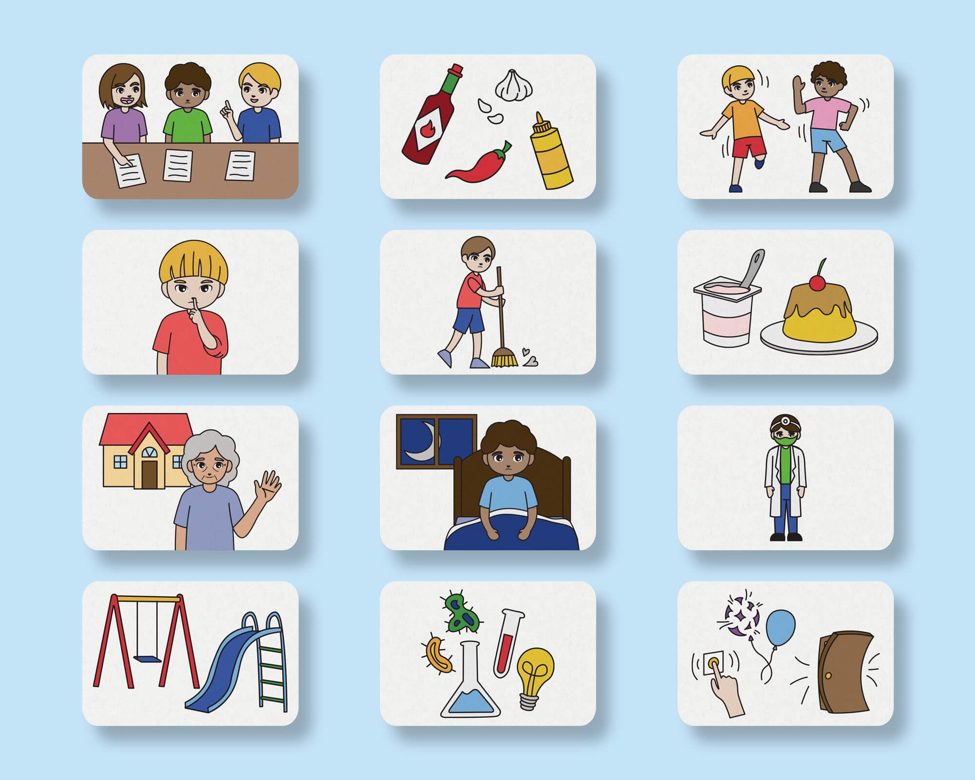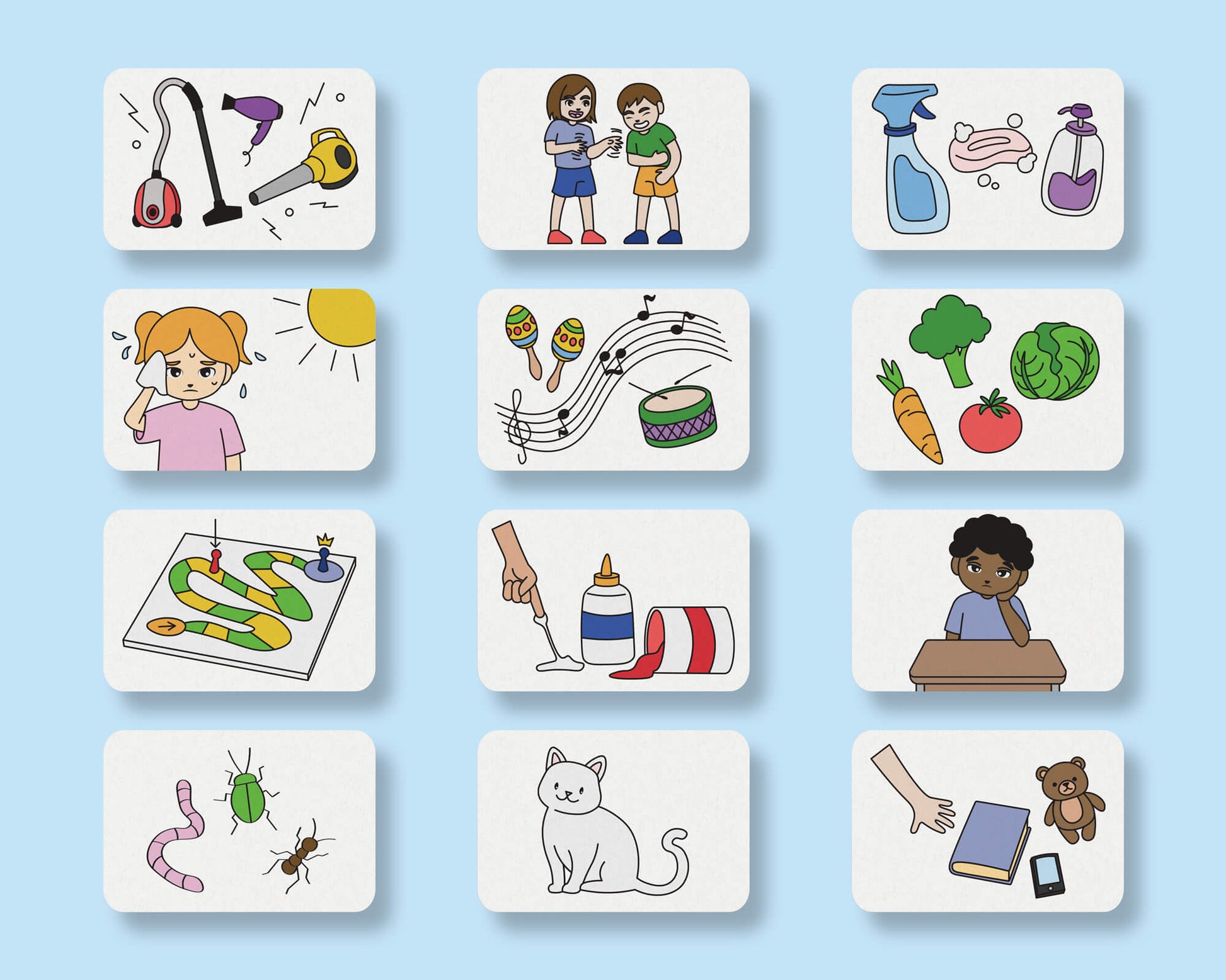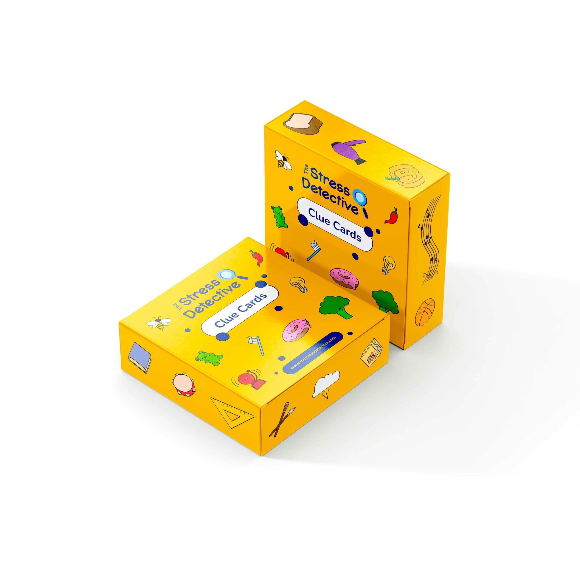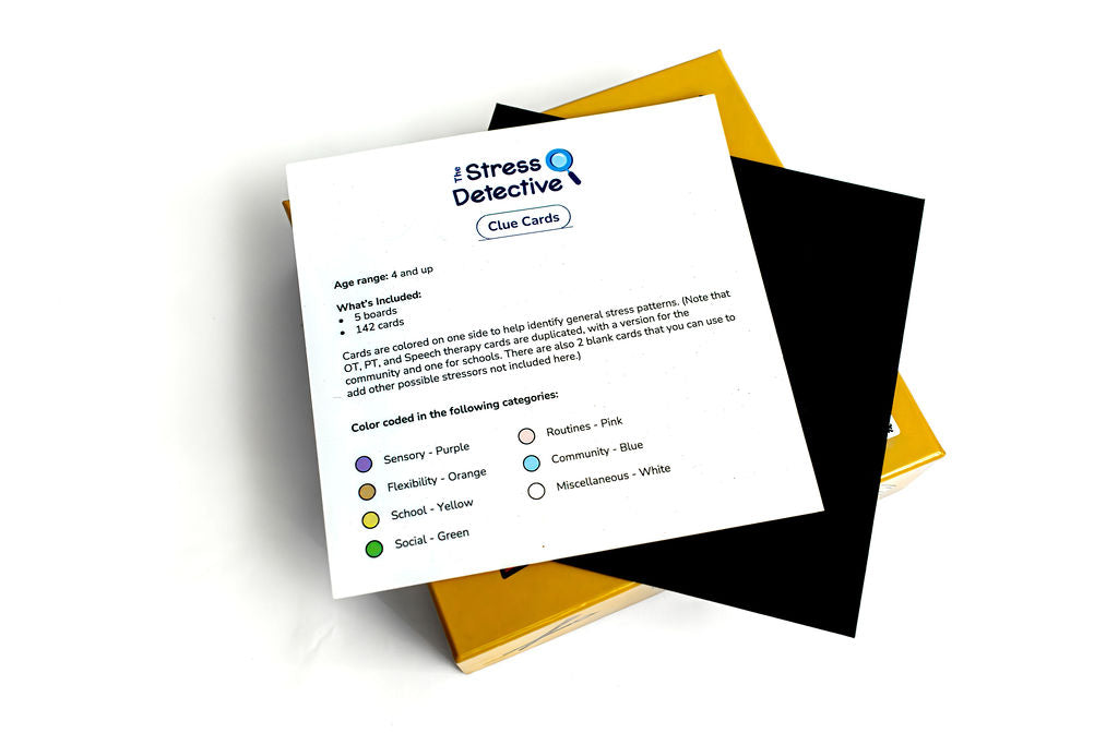 The Stress Detective: Clue Cards: a tool that helps you learn about a child's stressors. You choose which of the 142 cards children will sort then they are asked to rate them by placing them on one of the 5 boards to show how much they are bothered by the item on the card.